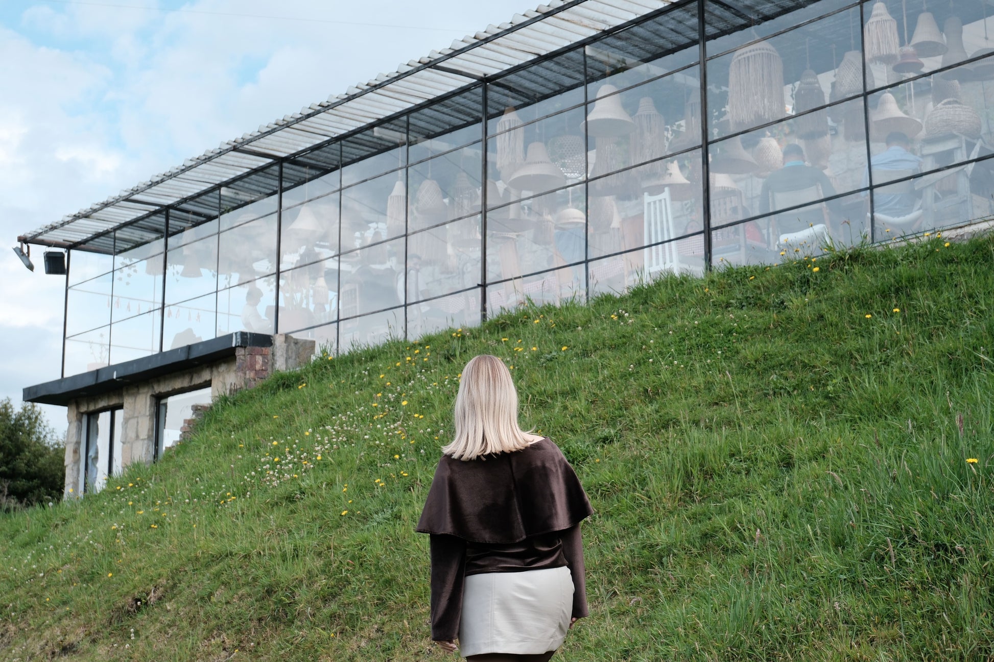 De silueta corta, con escote tipo barco, manga larga y una capa delicadamente unida al escote, este diseño combina movimiento y sutileza en cada detalle.