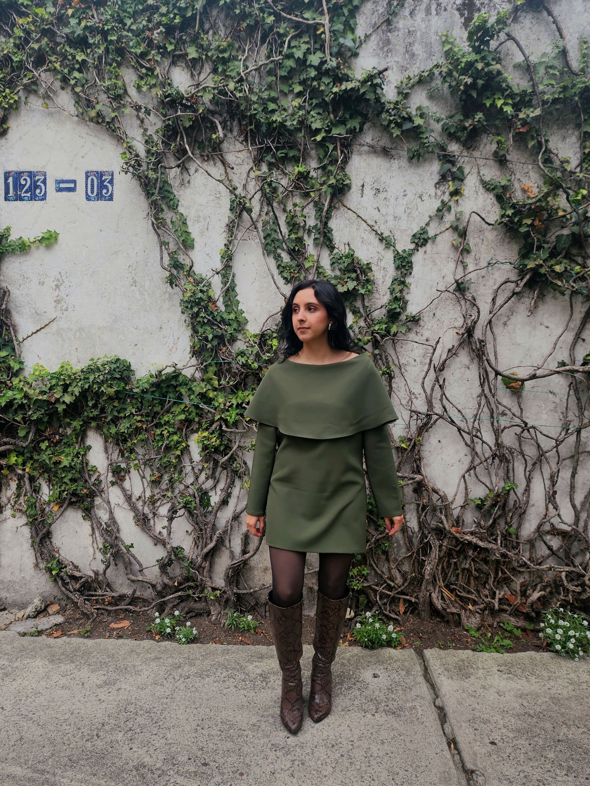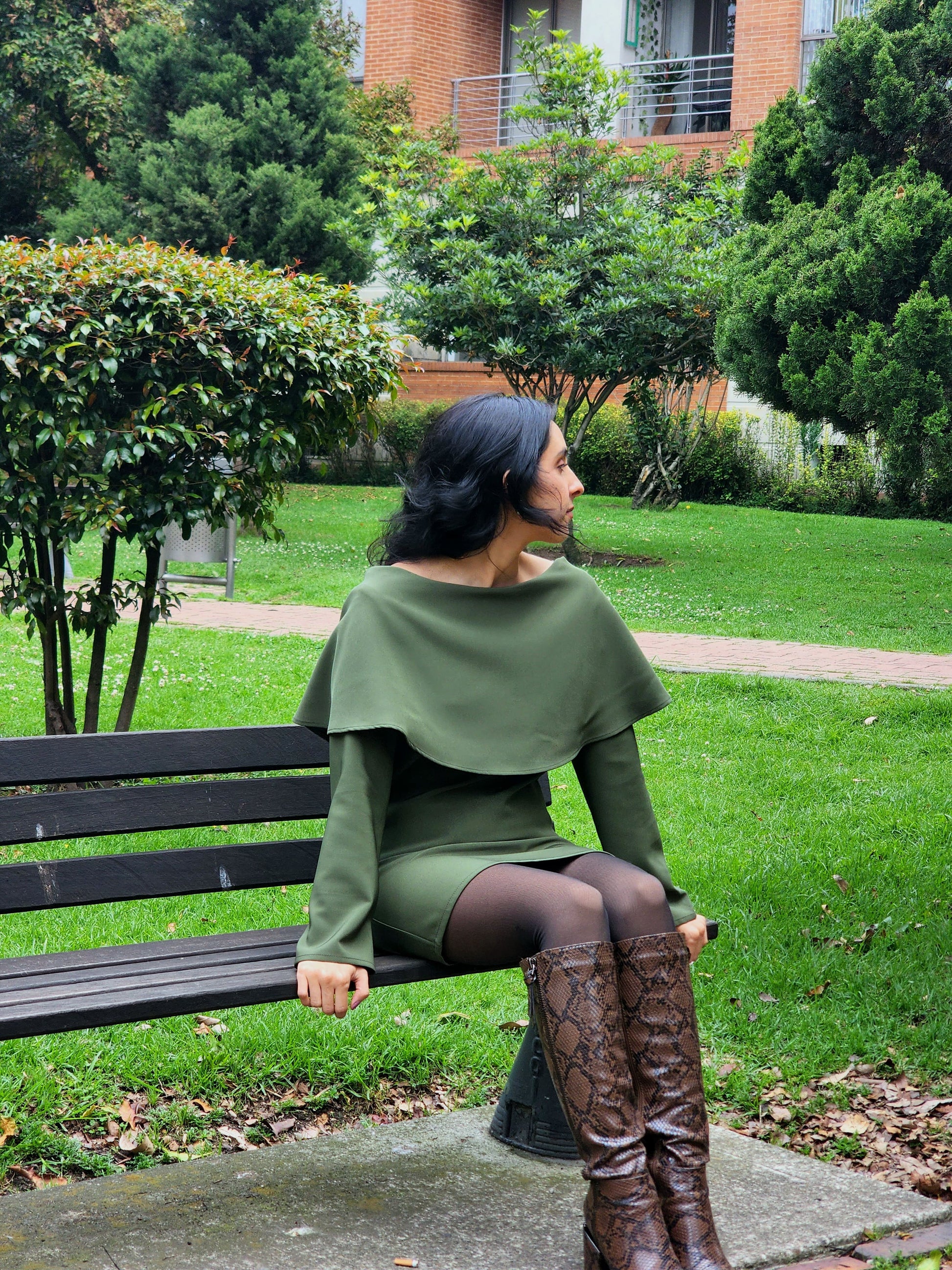 De silueta corta, con escote tipo barco, manga larga y una capa delicadamente unida al escote, este diseño combina movimiento y sutileza en cada detalle.